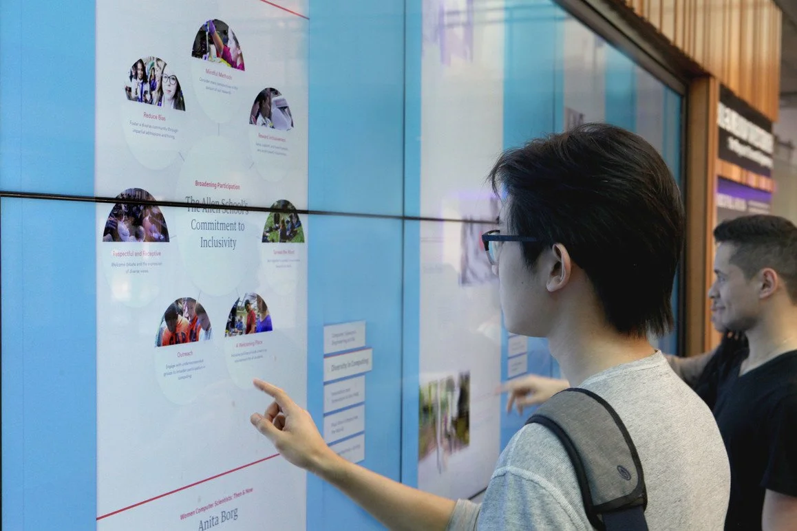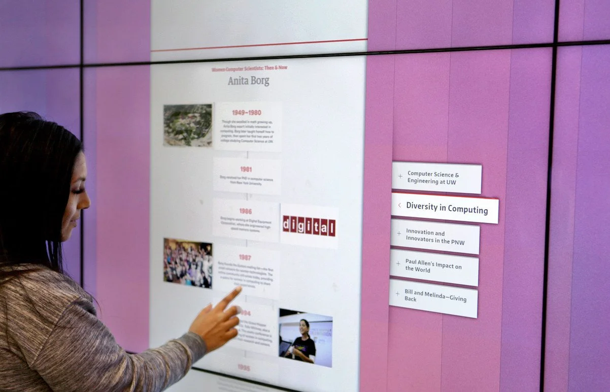 An interactive installation celebrating innovation, diversity, and discovery, The Tribute Wall welcomes visitors, students, and staff to the Bill & Melinda Gates Center at the University of Washington’s Paul G. Allen School of Computer Science & Engineering. The experience blends storytelling, technology, and design to illuminate the milestones and people shaping both the field of computer science and the region’s culture of invention.
